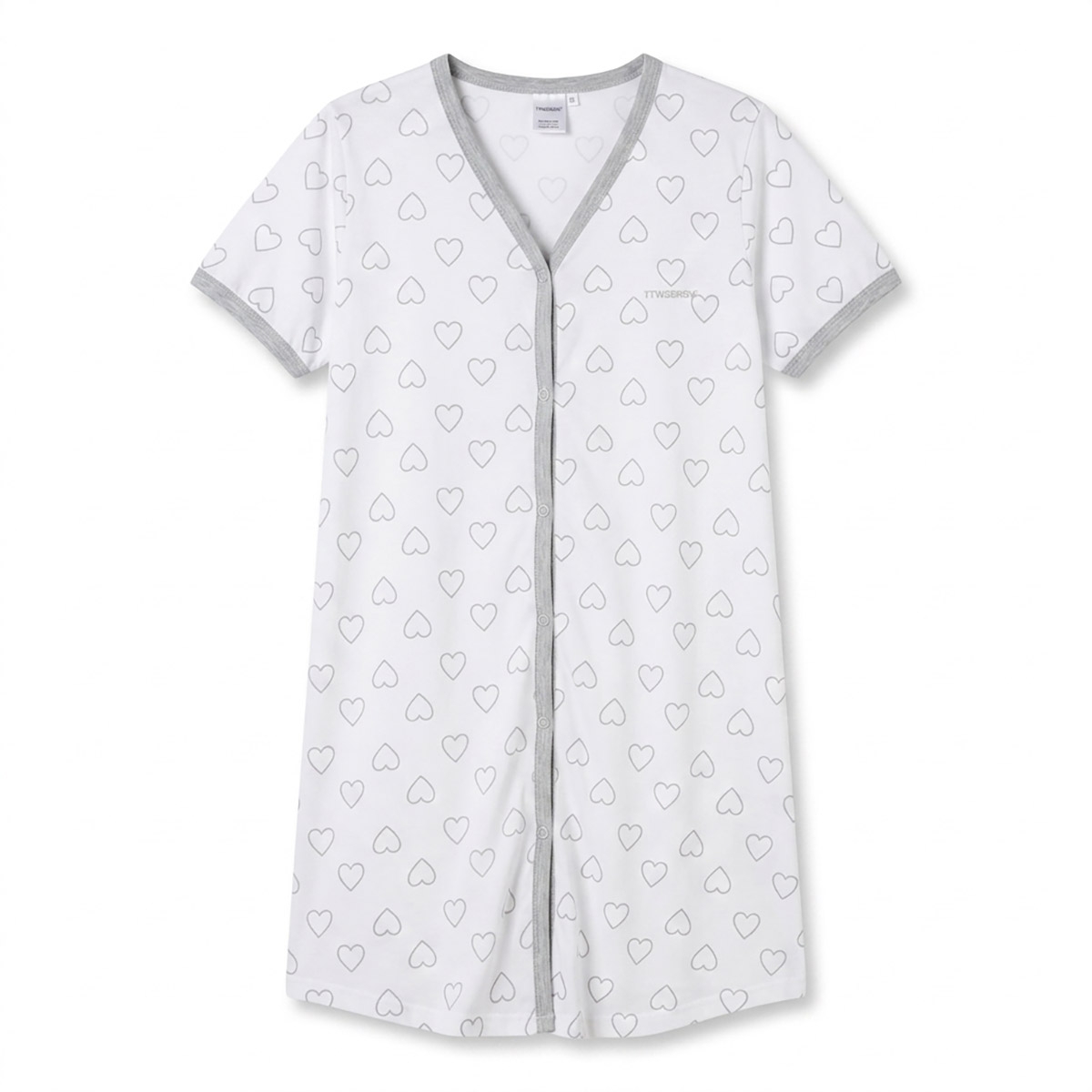 La delicata stampa a cuoricini e le finiture coordinate donano un aspetto dolce e curato. Un design semplice ma raffinato, pensato per farti sentire a tuo agio e femminile anche durante il ricovero e il post parto.