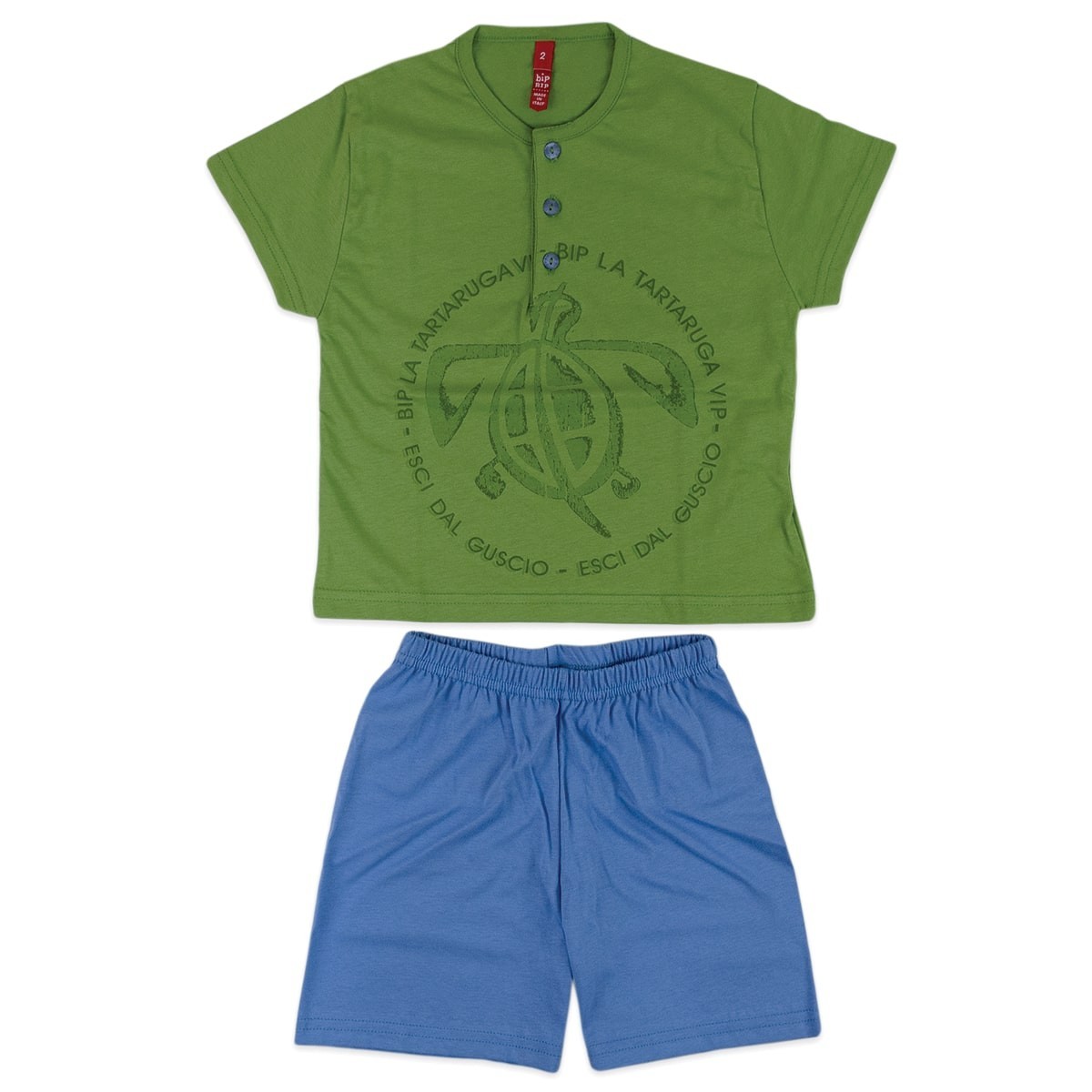 Pigiama bambino in puro cotone con manica e pantalone corto, la maglietta con abbottonatura serafino ha una stampa centrale raffigurante una tartaruga.