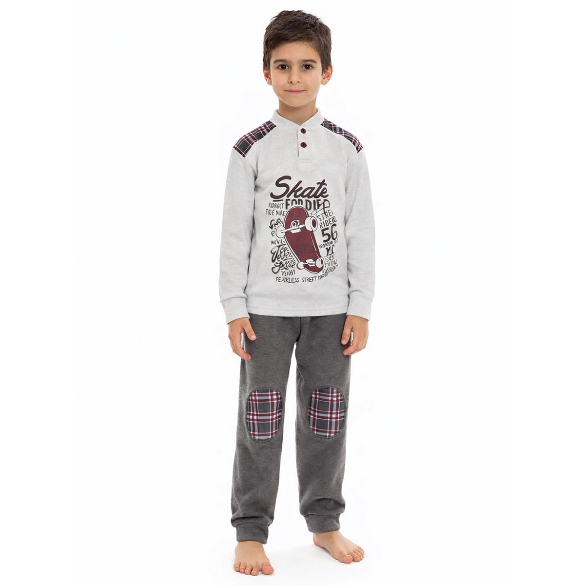 Pigiama per bambino in caldo cotone punto milano con una simpatica stampa centrale sulla maglia. Modello serafino con 2 bottoncini questo pigiama della collezione gary ha pantalone lungo blu.