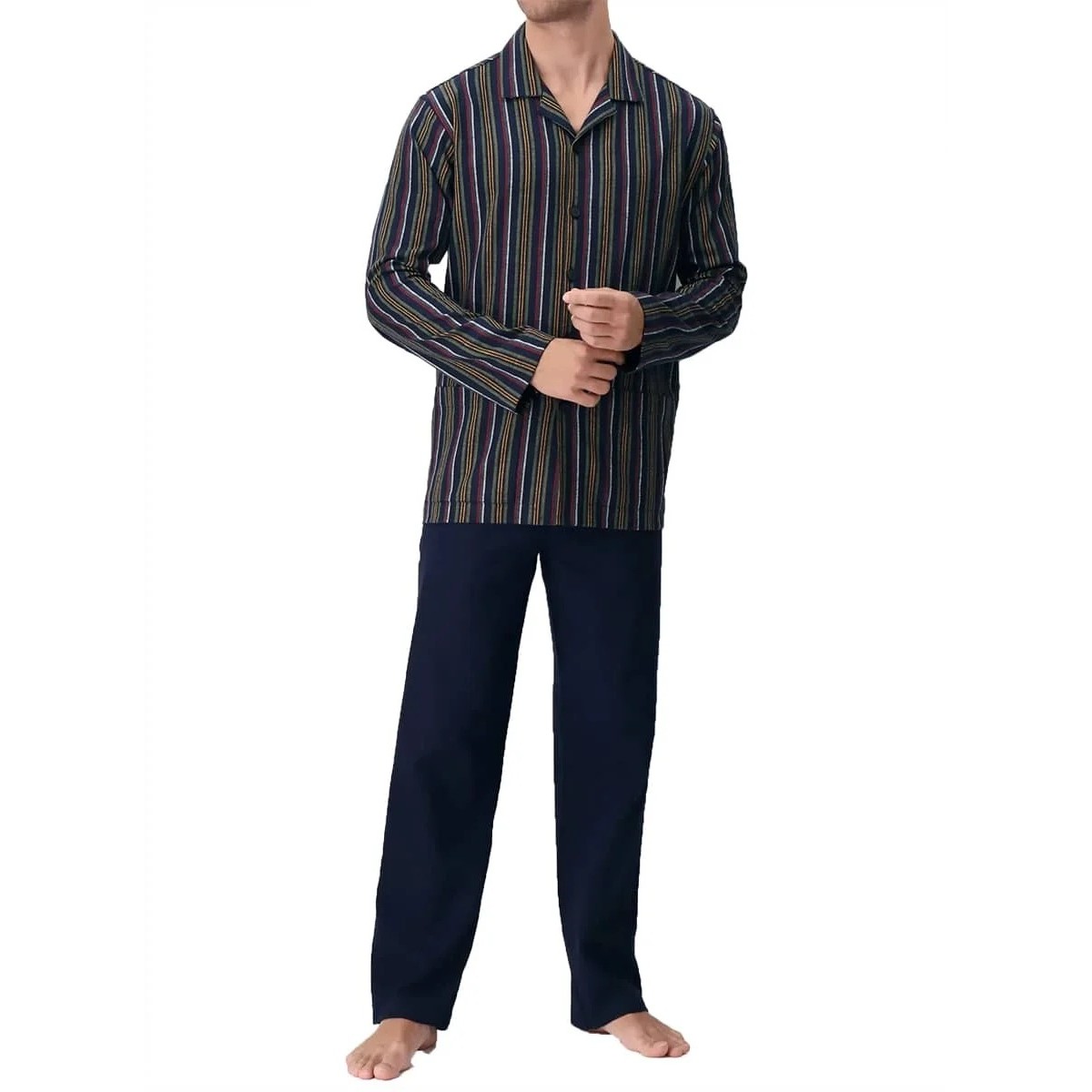 Pigiama per uomo in 100% flanella di puro cotone con righe verticali multicolor e camicia con collo aperto avanti.