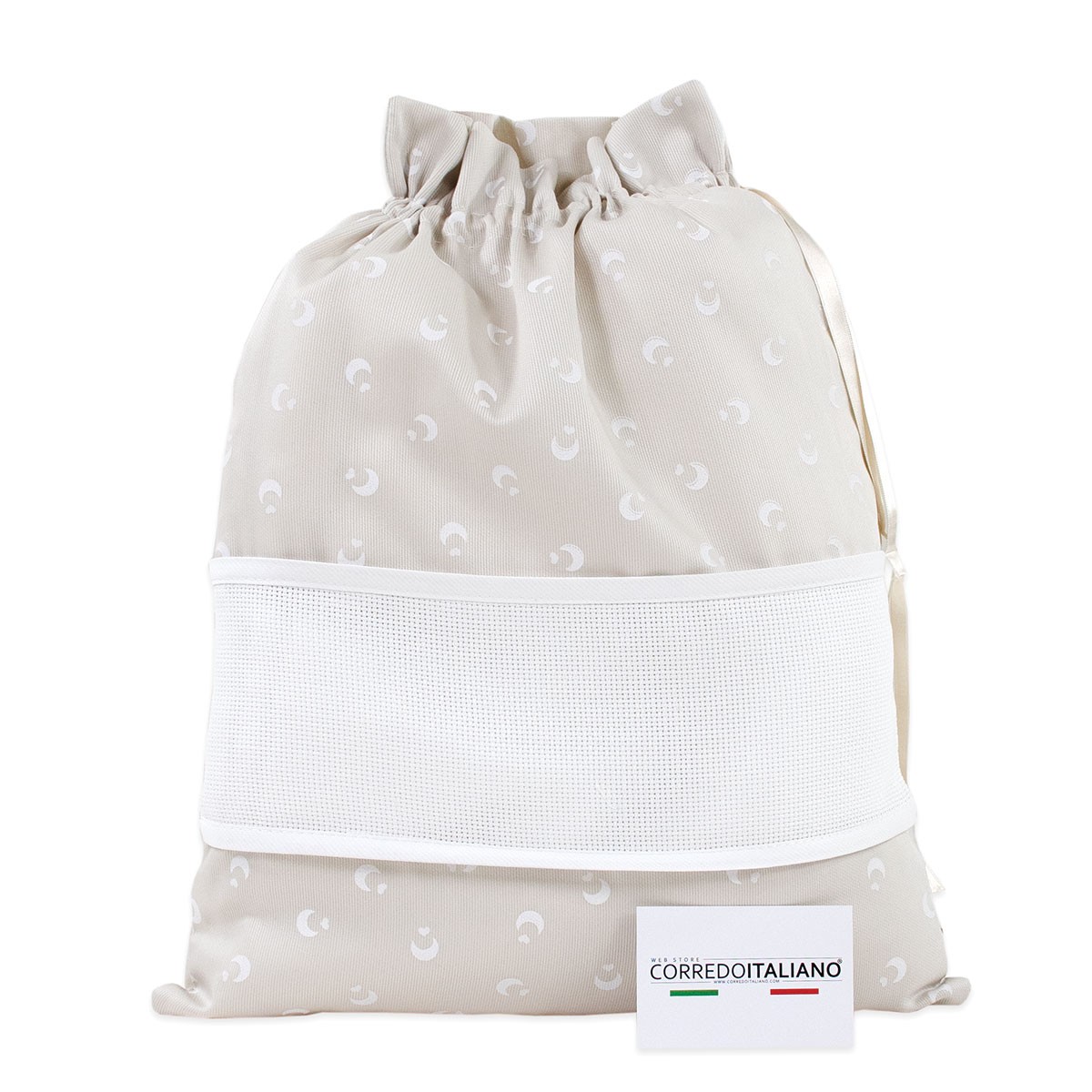 Realizzato in morbido cotone piquet, questo sacchetto portacorredino con fantasia di piccole mezzaluna rappresenta una soluzione pratica e raffinata per contenere il corredino del neonato, ideale sia per l’ospedale che per l’utilizzo quotidiano.