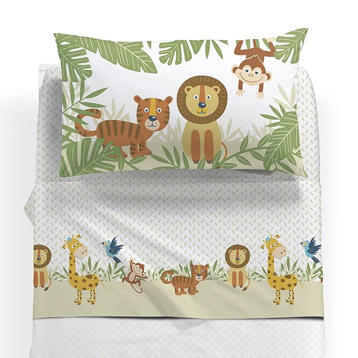 Con il set lenzuola Tropical per letto singolo, il tuo bambino viaggerà ogni notte tra simpatici leoni, tigri, scimmie e giraffe in un mondo fantastico di colori e allegria.