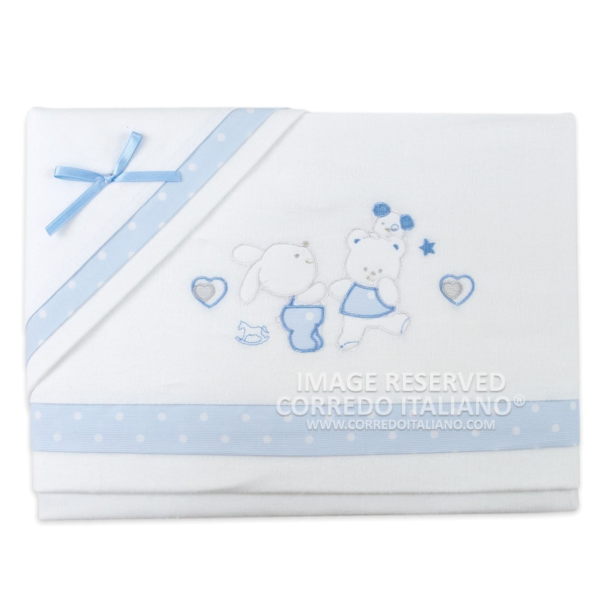 Completo lenzuola 3 pezzi in 100% puro cotone rifinito con orsetto ricamato a rilievo. Misure: Lenzuolo sopra 115x170 cm - Sottolenzuola con angoli 60x130x15 cm - Federa cuscino 52x40 cm. Prodotto ideato, tessuto e confezionato in Italia.