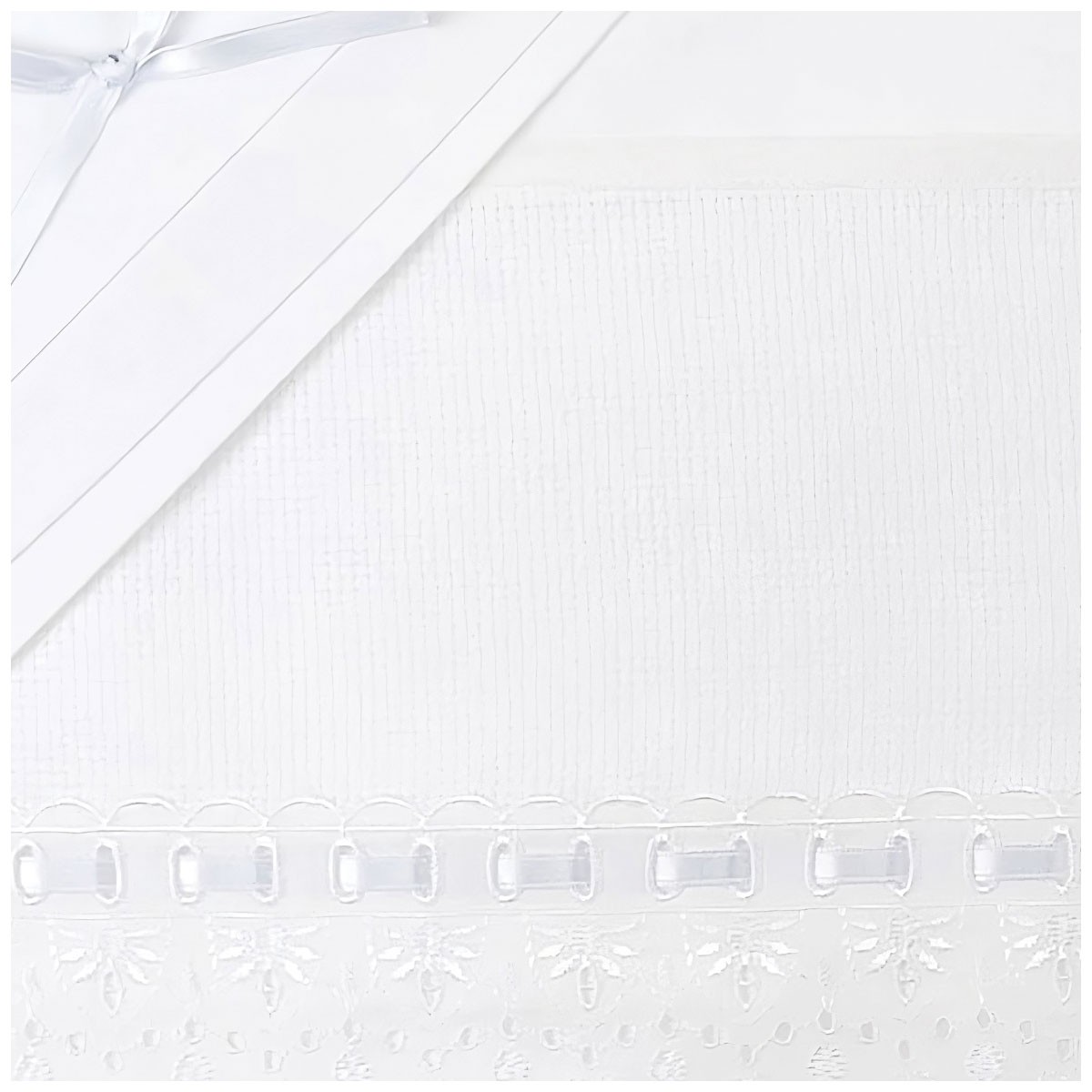 Il lenzuolo è confezionato con ottime finiture, impreziosite da bordo in pizzo traforato e passanastro in raso, che donano eleganza e raffinatezza. L’inserto in tela Aida sul lenzuolo di sopra è pensato per resistere ai ricami, mantenendo la trama compatta e ordinata.