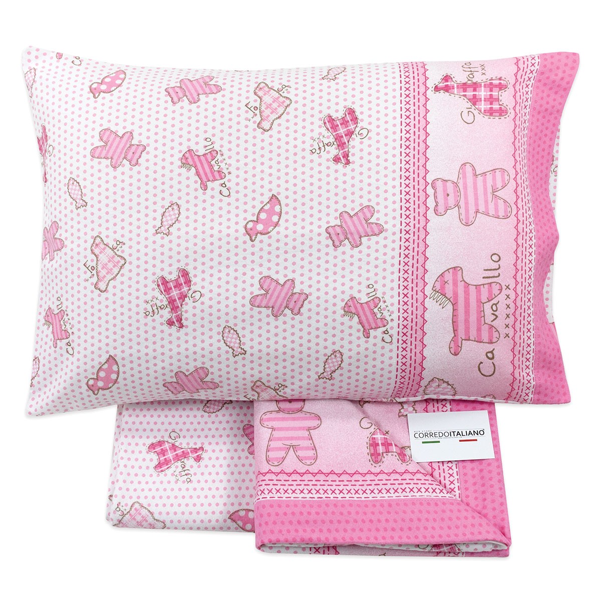 Misure: Lenzuolo sopra 120x180 cm – Sottolenzuolo con angoli 65x130x15 cm – Federa cuscino: 40x60 cm.
