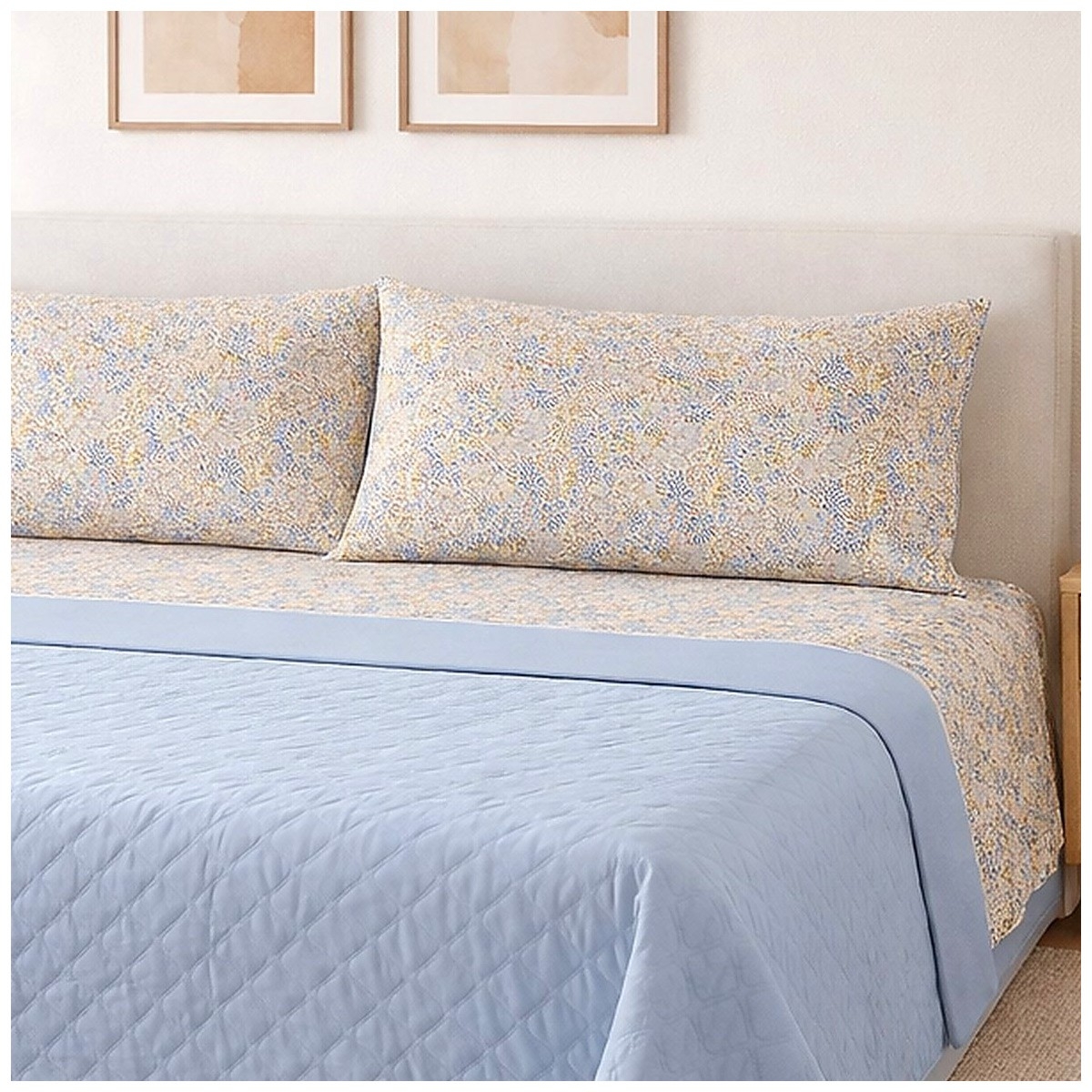 La federa a sacco abbinata completa l'estetica del set, mentre il lenzuolo sotto con angoli elasticizzati in tinta unita assicura una perfetta aderenza al materasso.