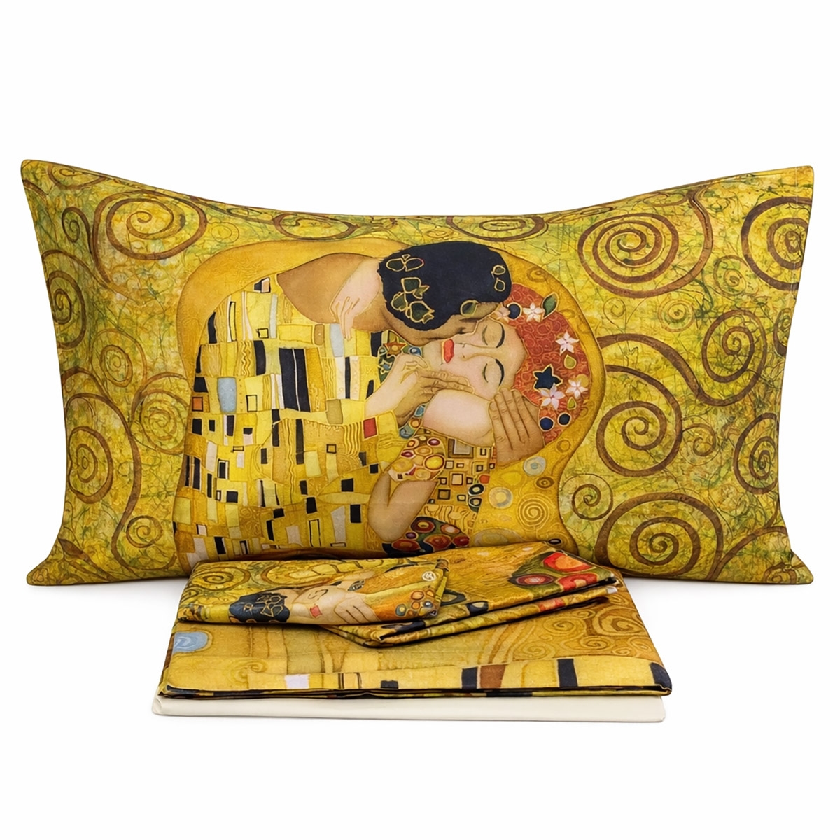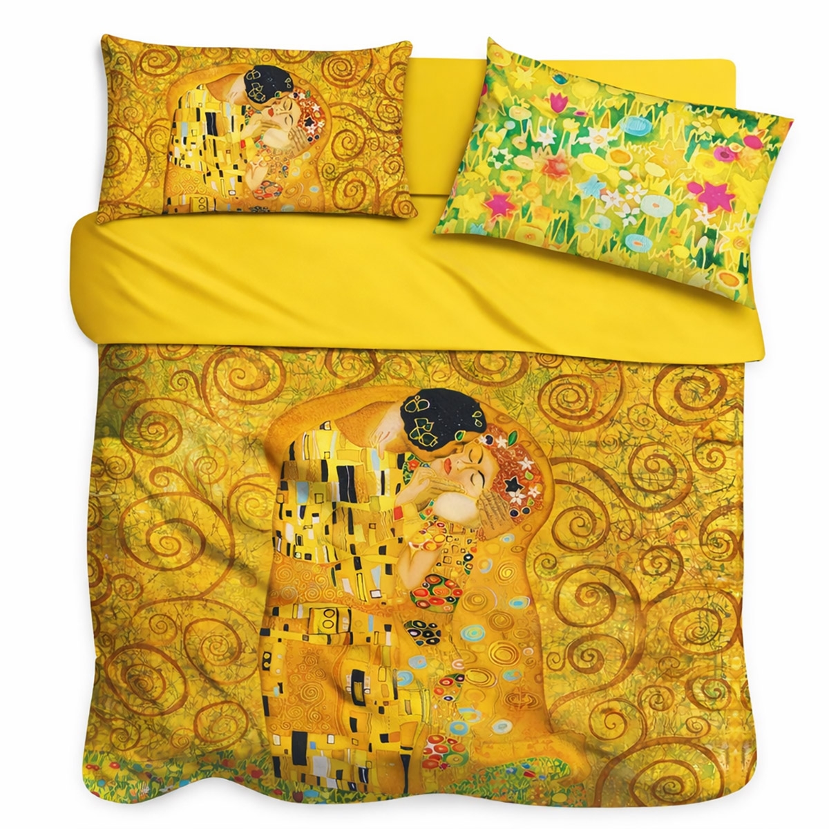 Completo lenzuola matrimoniale in puro cotone con stampa digitale ad alta definizione raffigurante "Il Bacio" di Gustav Klimt. Morbido, resistente e dal forte impatto decorativo.