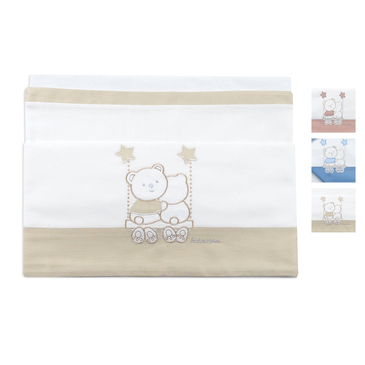 Il contrasto tra il bianco e i dettagli azzurri, unito al tenero ricamo con orsetto, crea un effetto visivo dolce e armonioso. Un set lenzuola che non è solo funzionale, ma anche capace di valorizzare la culla con un tocco raffinato e accogliente.