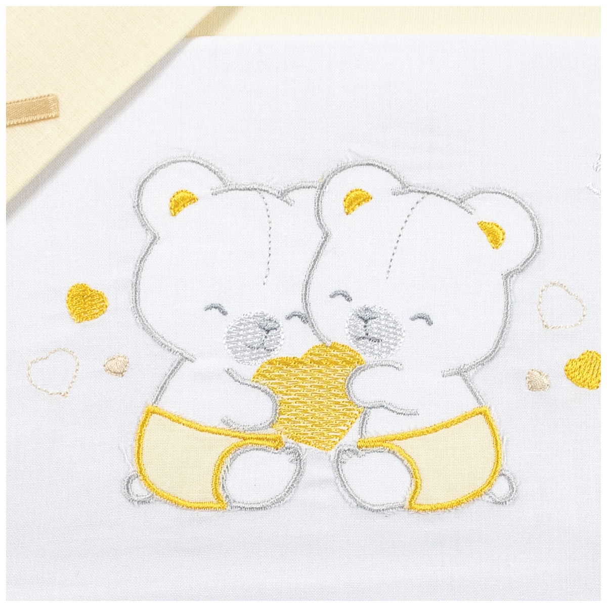 Il set lenzuola per culletta e carrozzina della collezione Mio Piccolo è pensato per vestire con delicatezza i primi sogni del tuo bimbo. Il lenzuolino superiore è impreziosito da un ricamo dolce con due orsetti abbinati a bordi coordinati per un effetto armonioso. Ideale per culla, navicella e carrozzina, dona ordine e stile al lettino, mantenendo una sensazione di freschezza e comfort sulla pelle. Una scelta perfetta anche come idea regalo nascita, curata nei particolari e pronta a valorizzare ogni corredino.