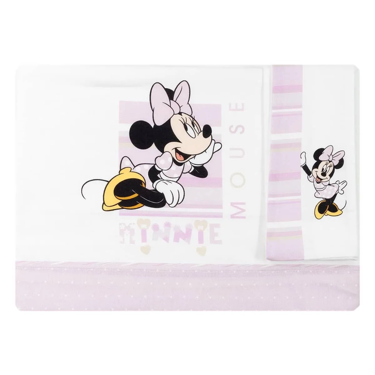 Completo lenzuola 3 pezzi in puro cotone della collezione Disney baby rifinito con la simpatica Minnie stampata sul lenzuolo sopra.
