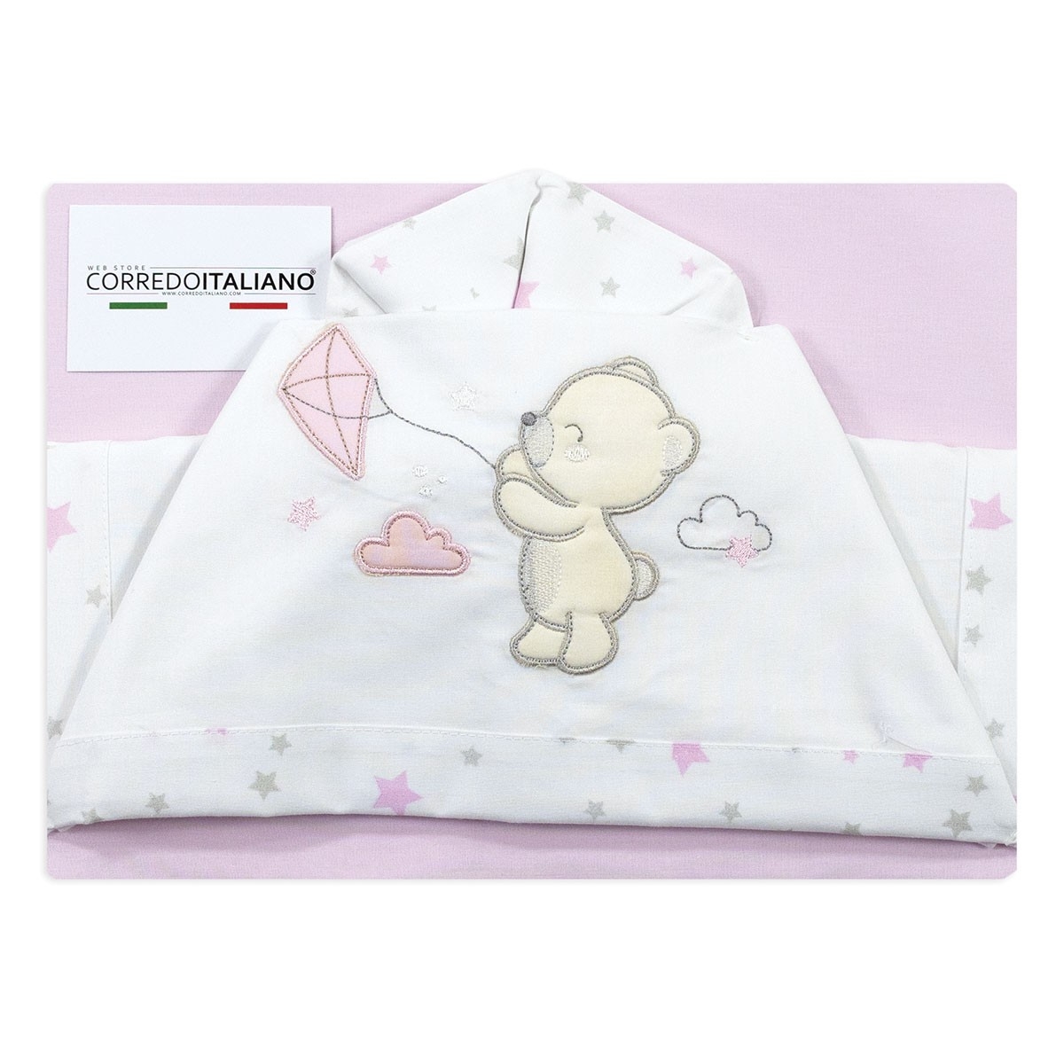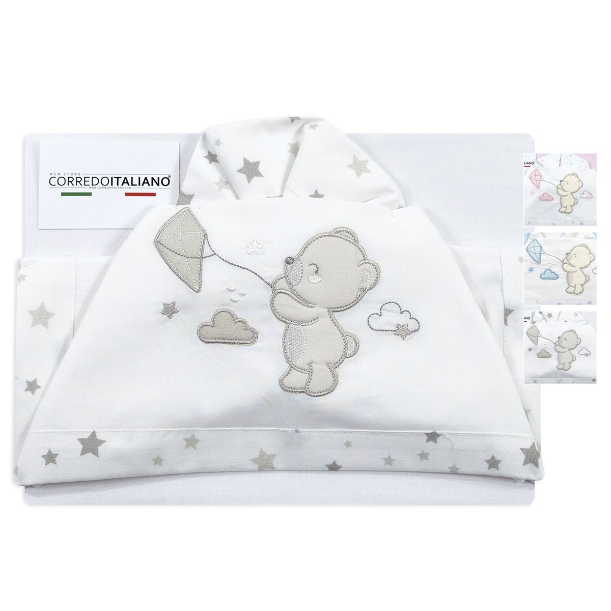 Le lenzuola neonati Bruco Bruco con orsetto ricamato e dettagli stellati rappresentano la perfetta fusione tra artigianalità e tenerezza. Un set raffinato, pratico e 100% Made in Italy.