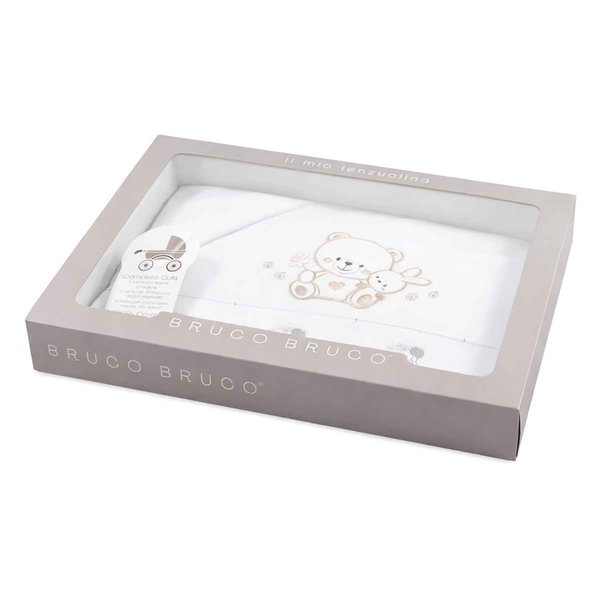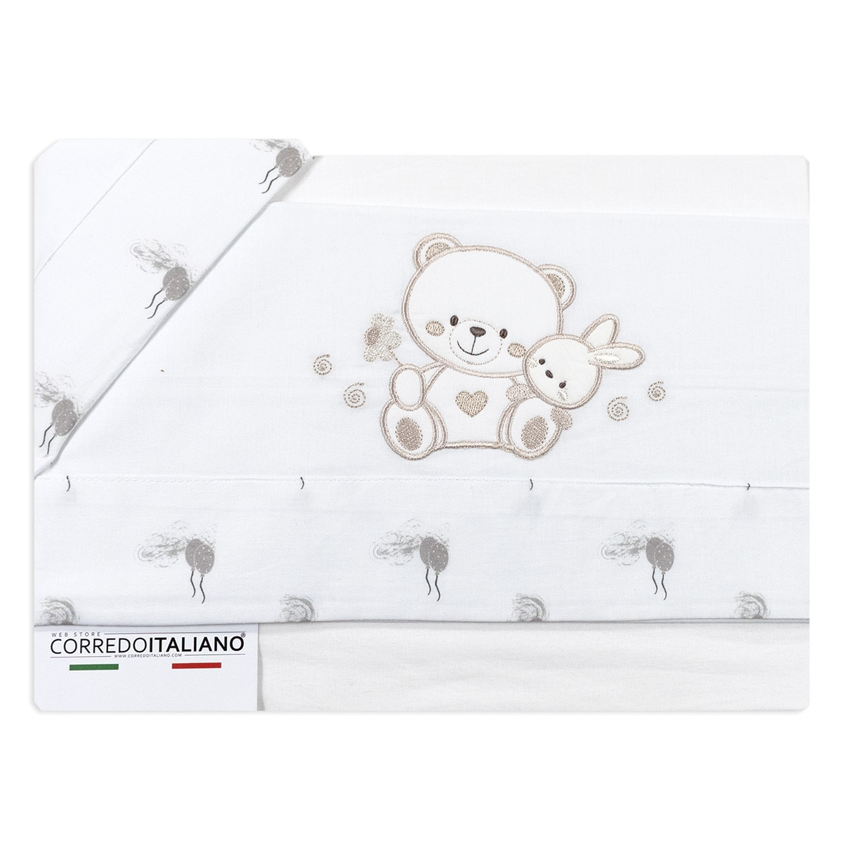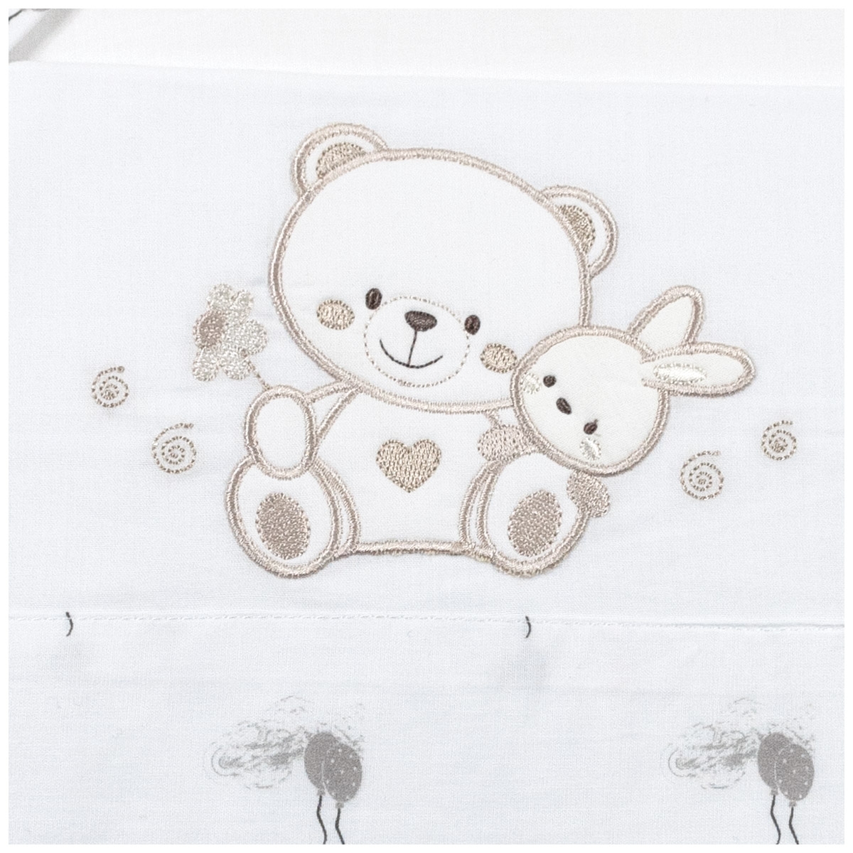 Il lenzuolino superiore è arricchito da un ricamo delicato con orsetto e coniglietto, eseguito con precisione per offrire un risultato armonioso e duraturo. Le cuciture sono morbide e resistenti, studiate per evitare fastidi sulla pelle e mantenere la qualità del prodotto anche dopo numerosi lavaggi.