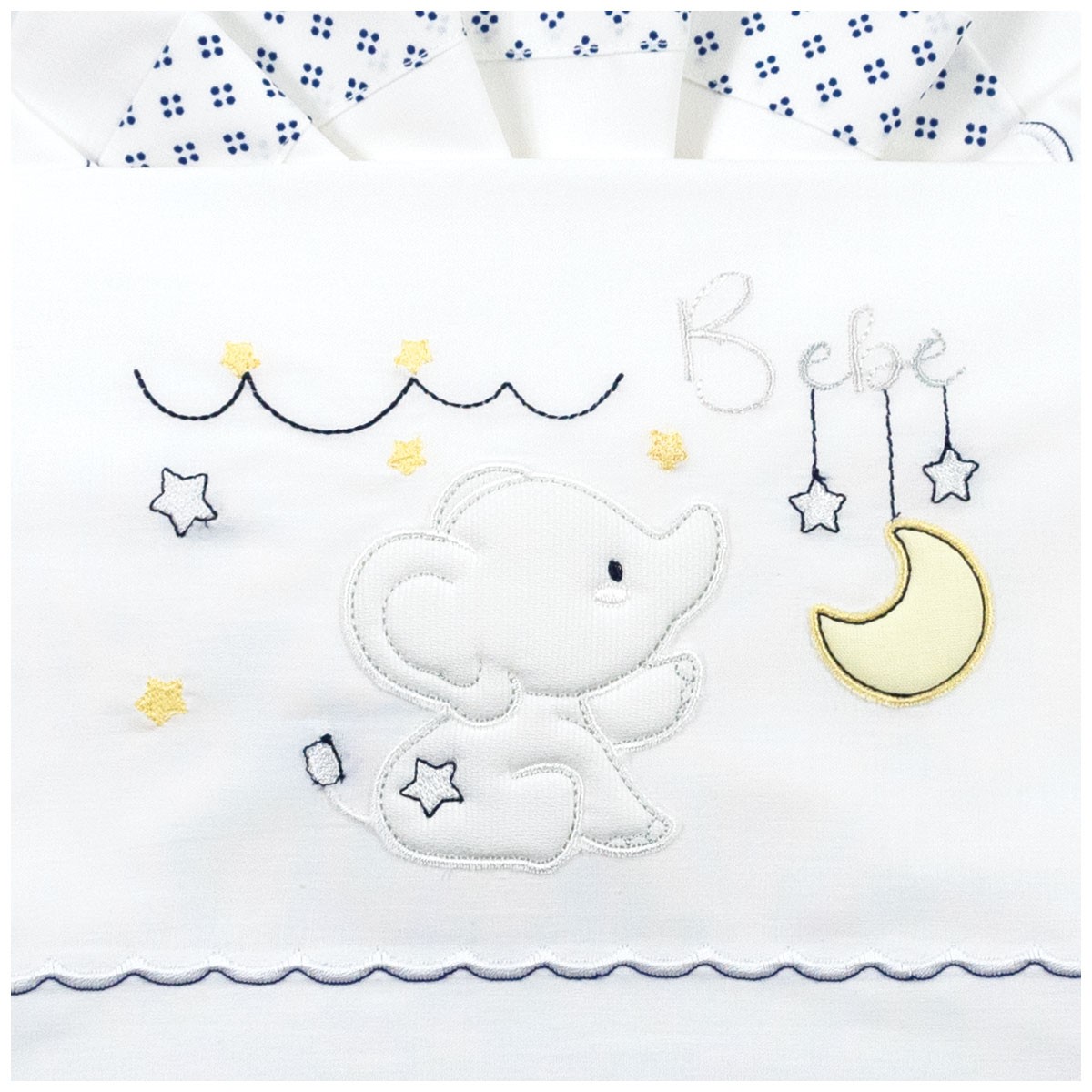 - Un lenzuolo superiore decorato con un delicato ricamino di un elefantino che gioca con la luna e le stelle, perfetto per creare un'atmosfera serena e accogliente.