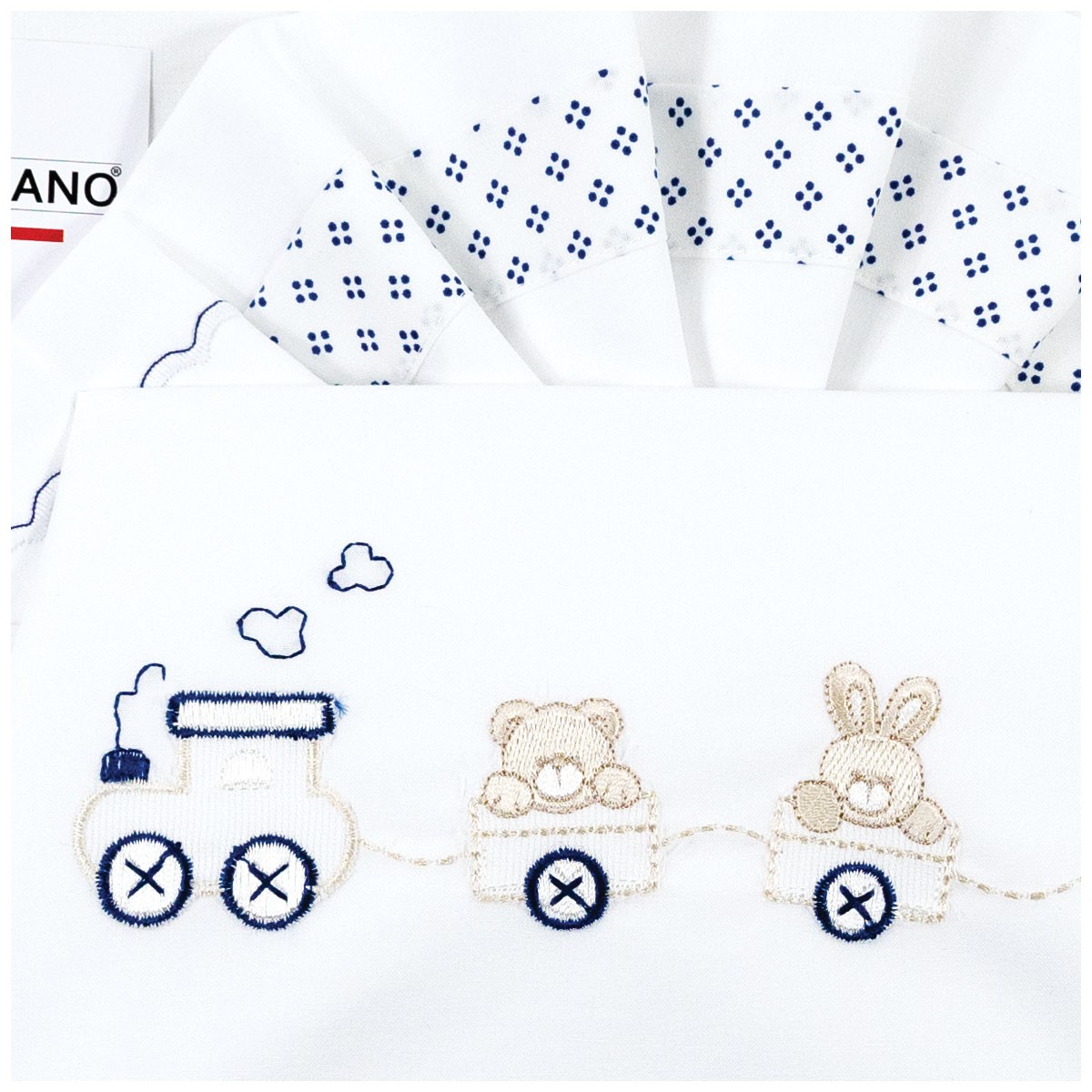 Il design presenta delicati dettagli ricamati con motivi a tema cuccioli su di un trenino, rifiniti con inserti in tessuto a rombi colorati.