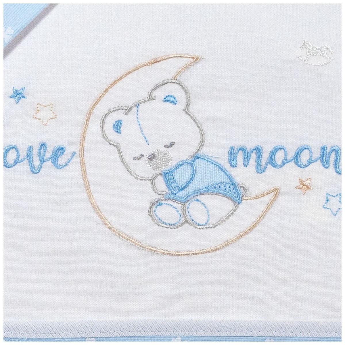 Il ricamo centrale rappresenta una scena incantevole con un orsetto teneramente addormentato su una mezzaluna.