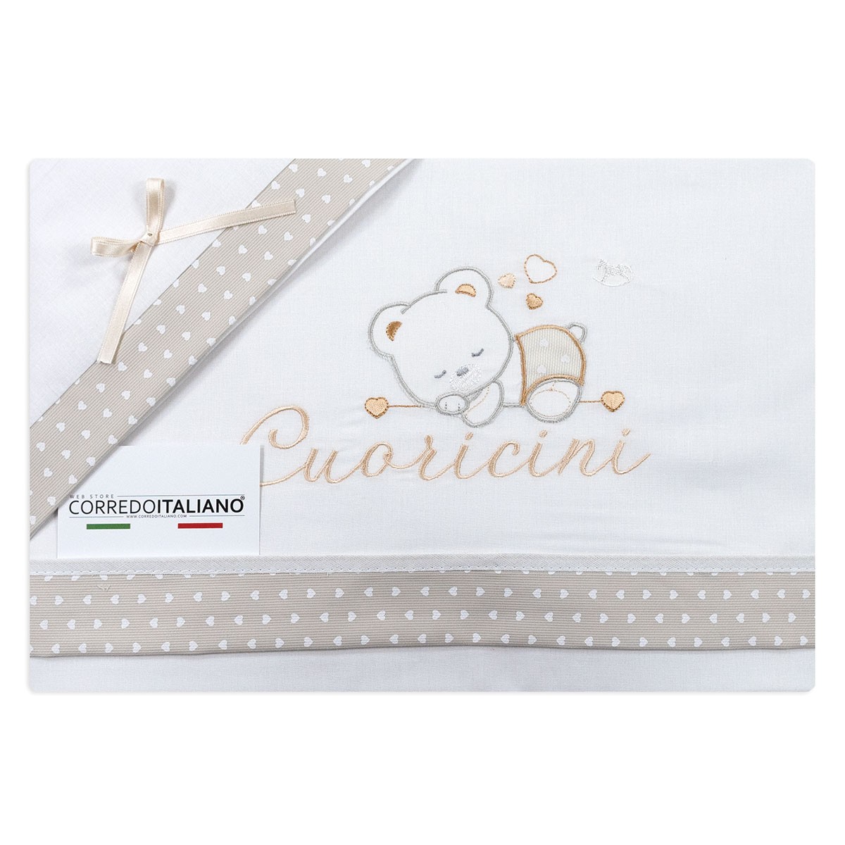 Ogni lenzuolino viene rifinito con bordini in tessuto fantasia a cuoricini e applicazioni ricamate con tecniche artigianali di alta precisione. Le cuciture sono studiate per garantire resistenza e sicurezza, evitando sporgenze o elementi fastidiosi per il bambino.