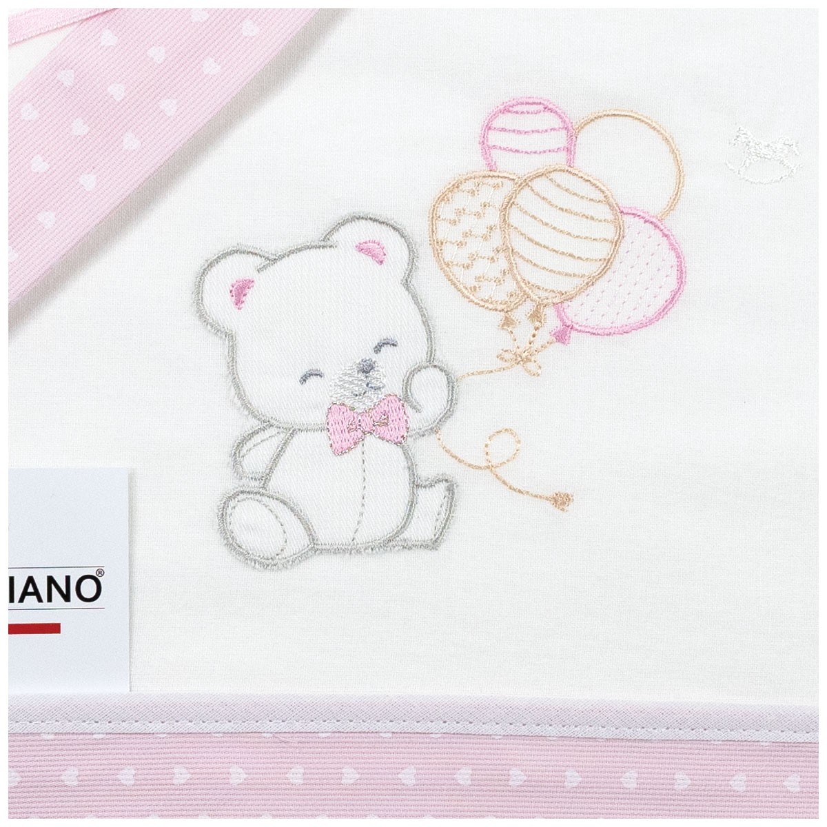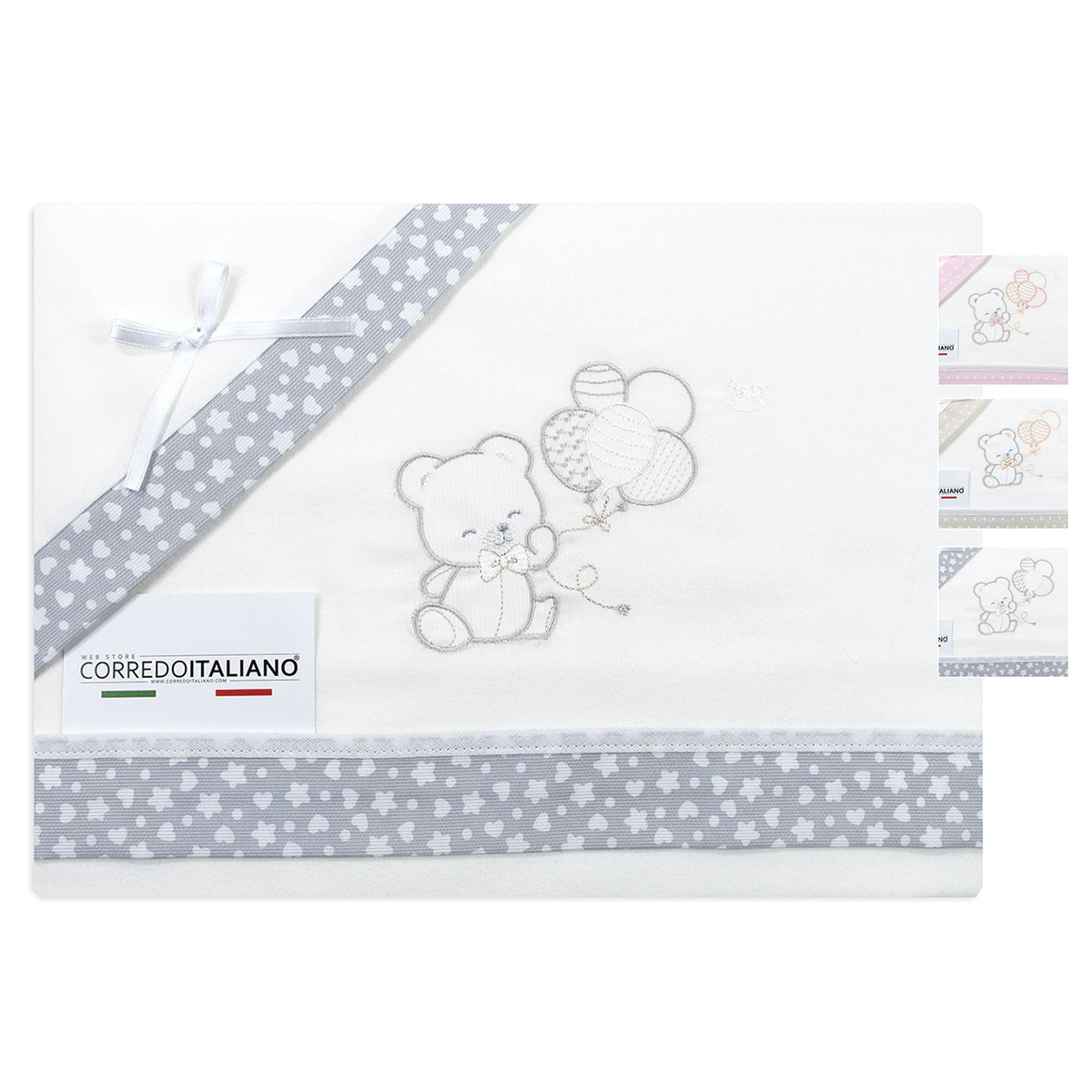 Questo set lenzuola si distingue per il suo stile romantico e raffinato. Il tenero orsetto ricamato con palloncini e i delicati pois donano al corredino un tocco di dolcezza e tenerezza. Perfetto anche come idea regalo nascita, completa la la carrozzina del neonato con eleganza e qualità italiana.