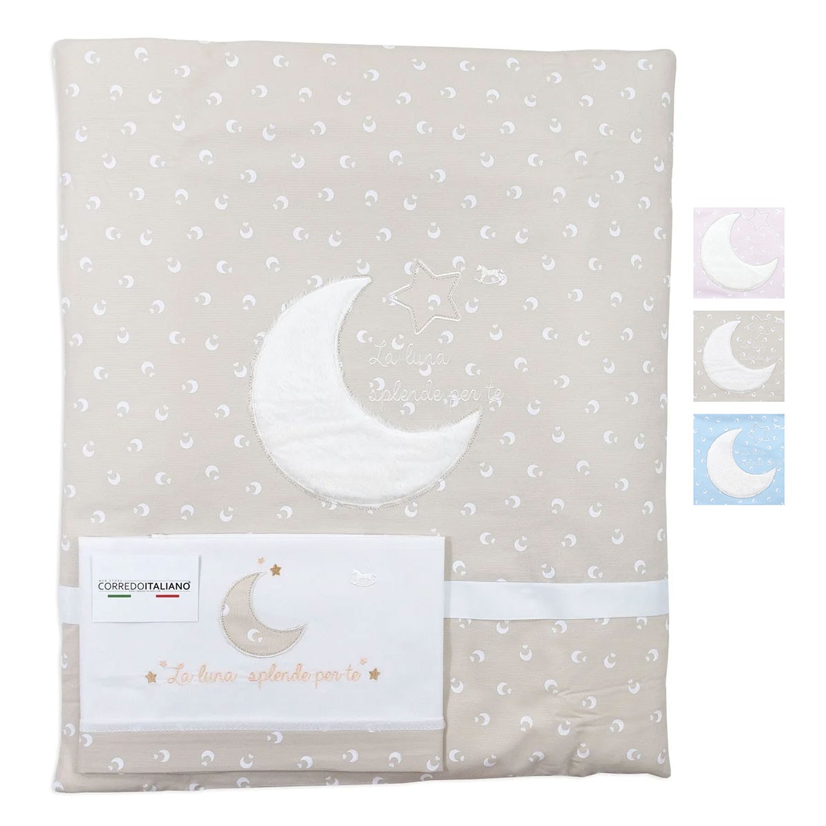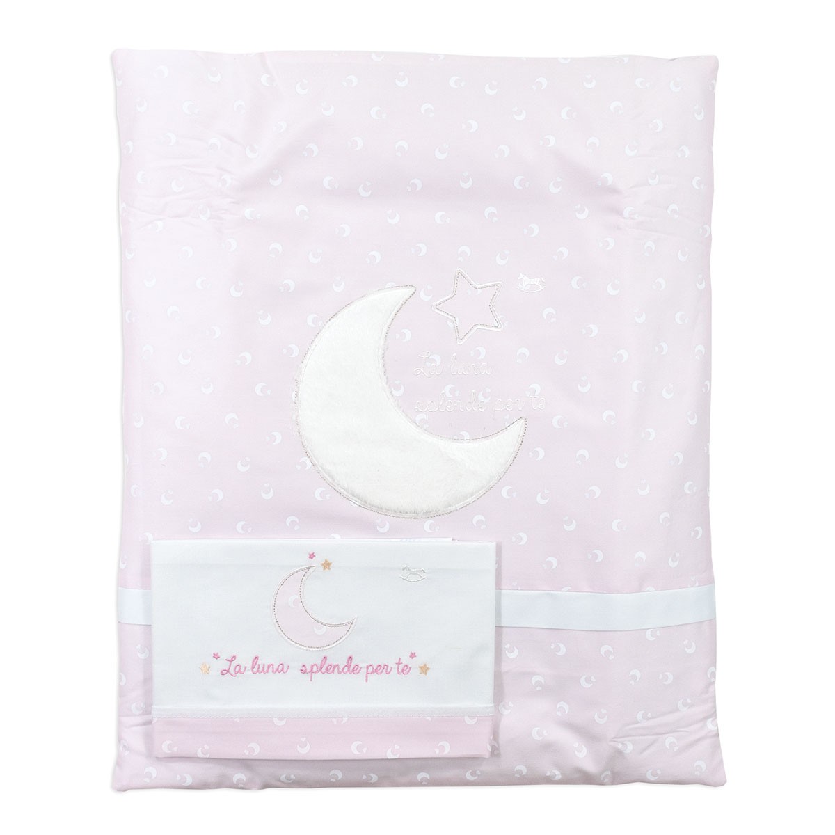 Questo dolcissimo coordinato per culletta è composto da piumotto con imbottitura sfilabile in fibra anallergica e set lenzuola coordinato. Il piumotto presenta un delicato ricamo centrale a mezzaluna che riprende la fantasia del lenzuolo sopra, arricchito dalla frase “La luna splende per te”. Un completo elegante e funzionale, pensato per offrire al tuo bambino comfort e dolcezza in ogni stagione.
