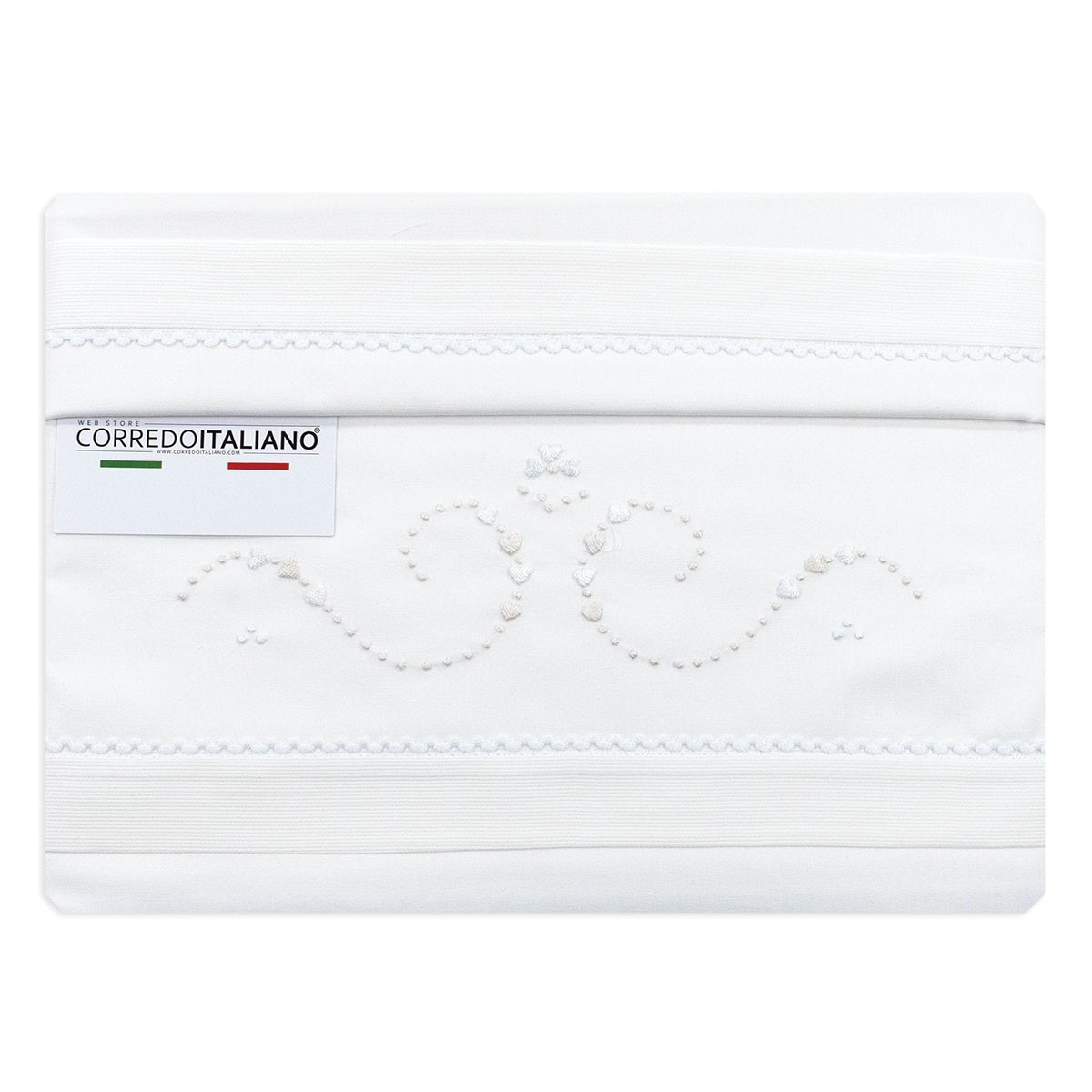 Raffinatissimo set lenzuolino per lettino baby ricamato a mano, realizzato con la massima cura artigianale e con materiali di altissima qualità. Il completo, in cotone naturale di prima scelta, presenta un ricamo eseguito a mano con piccoli cuori e decori tono su tono, impreziosito da un delicato bordo traforato. Un capo unico, elegante e senza tempo, perfetto per il riposo del tuo bambino e per completare il corredino con un tocco di pregio e raffinatezza Made in Italy.