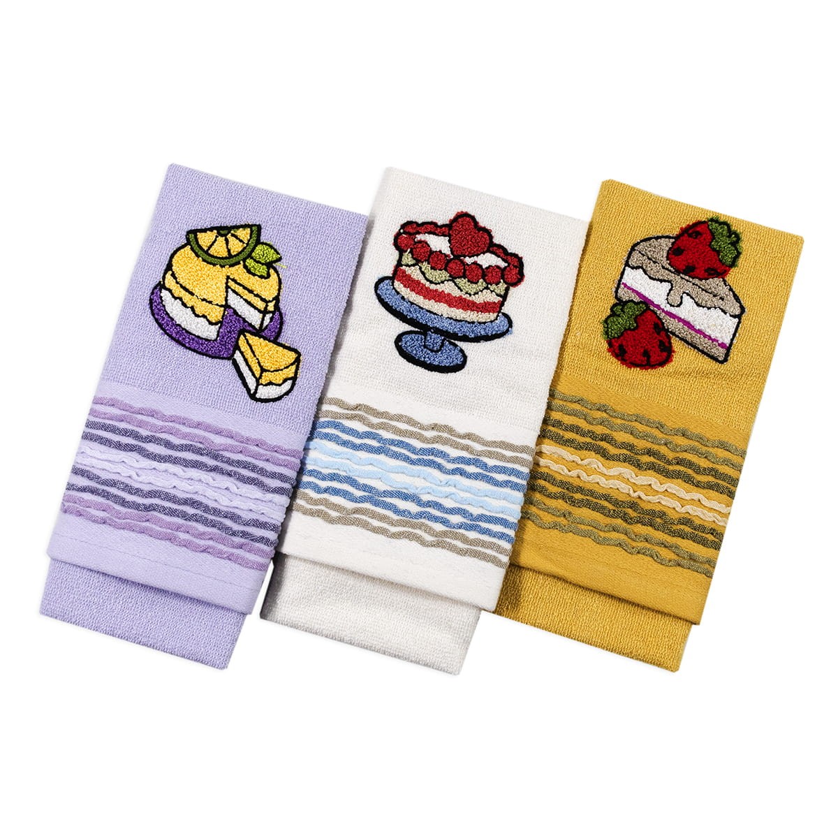 Gli strofinacci sono caratterizzati da simpatiche applicazioni ricamate raffiguranti torte e dolci.