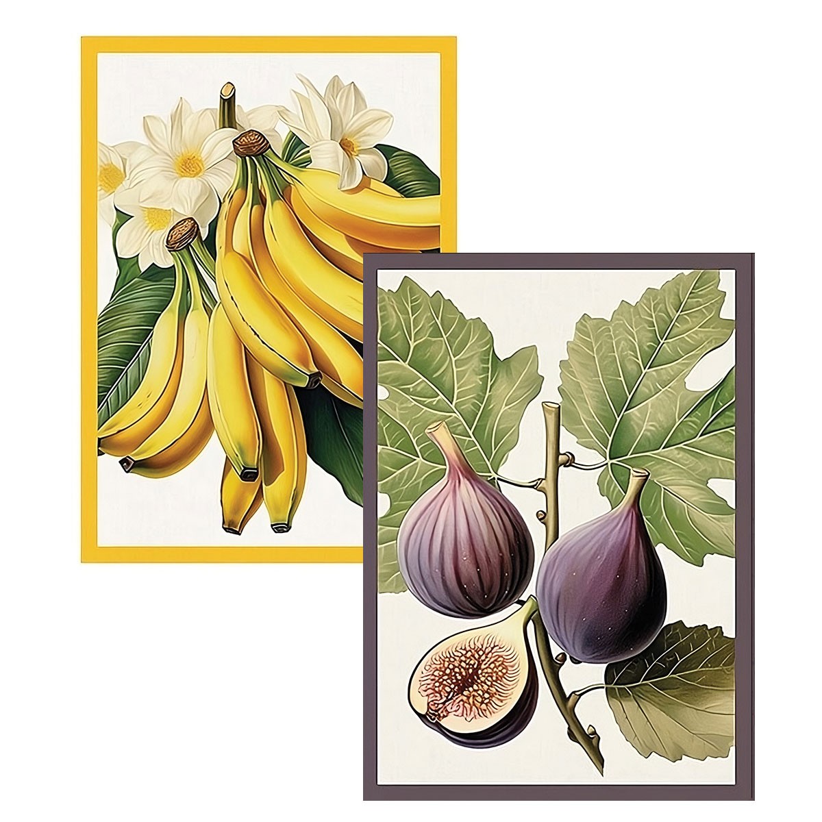 Le stampe, ad alta definizione, raffigurano una composizione di banane con fiori a corredo e un ramo di fichi con foglie ampie, entrambe caratterizzate da colori e dettagli curati, pensati per dare personalità e funzionalità alla cucina.