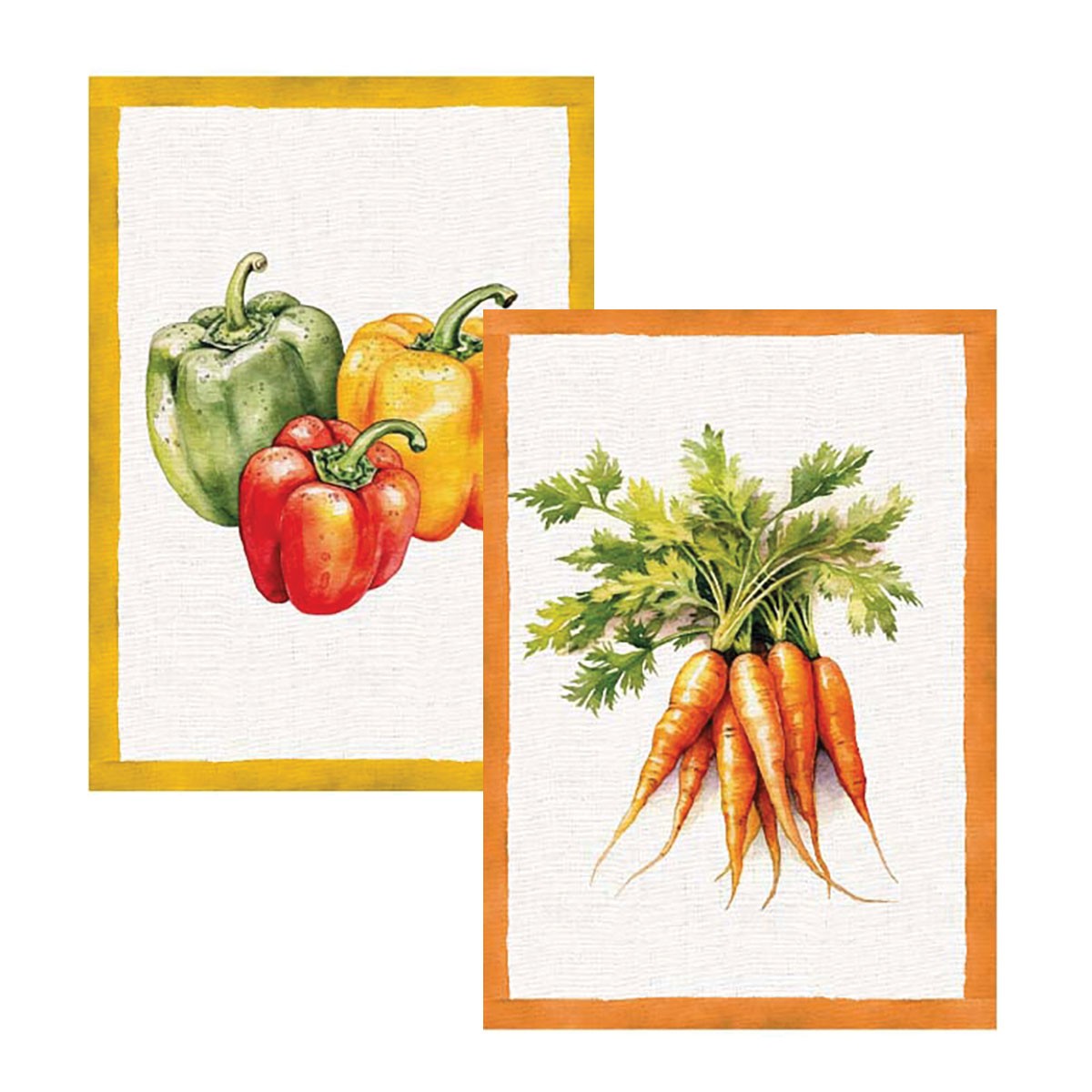 Composto da due strofinacci di cotone 100%, il set propone soggetti vivaci ispirati al mondo vegetale: un mazzo di carote con foglie rigogliose e un gruppo di peperoni nei toni verde, giallo e rosso.