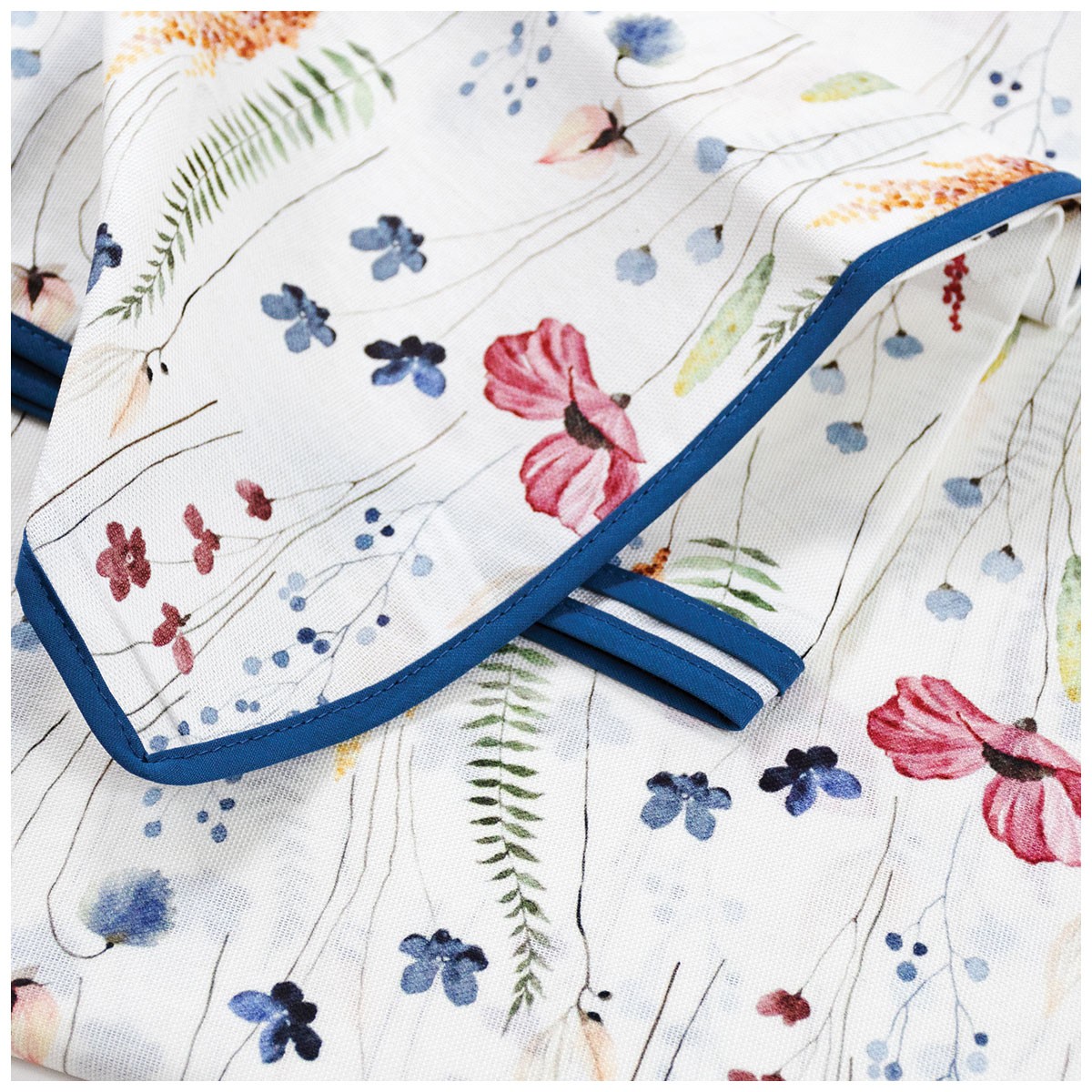 Realizzata in puro cotone 100%, questa tovaglia stampata si distingue per la qualità del tessuto e la vivacità del motivo floreale, ispirato ai fiori di campo primaverili: papaveri, fiordalisi, felci e rametti dai toni pastello.
