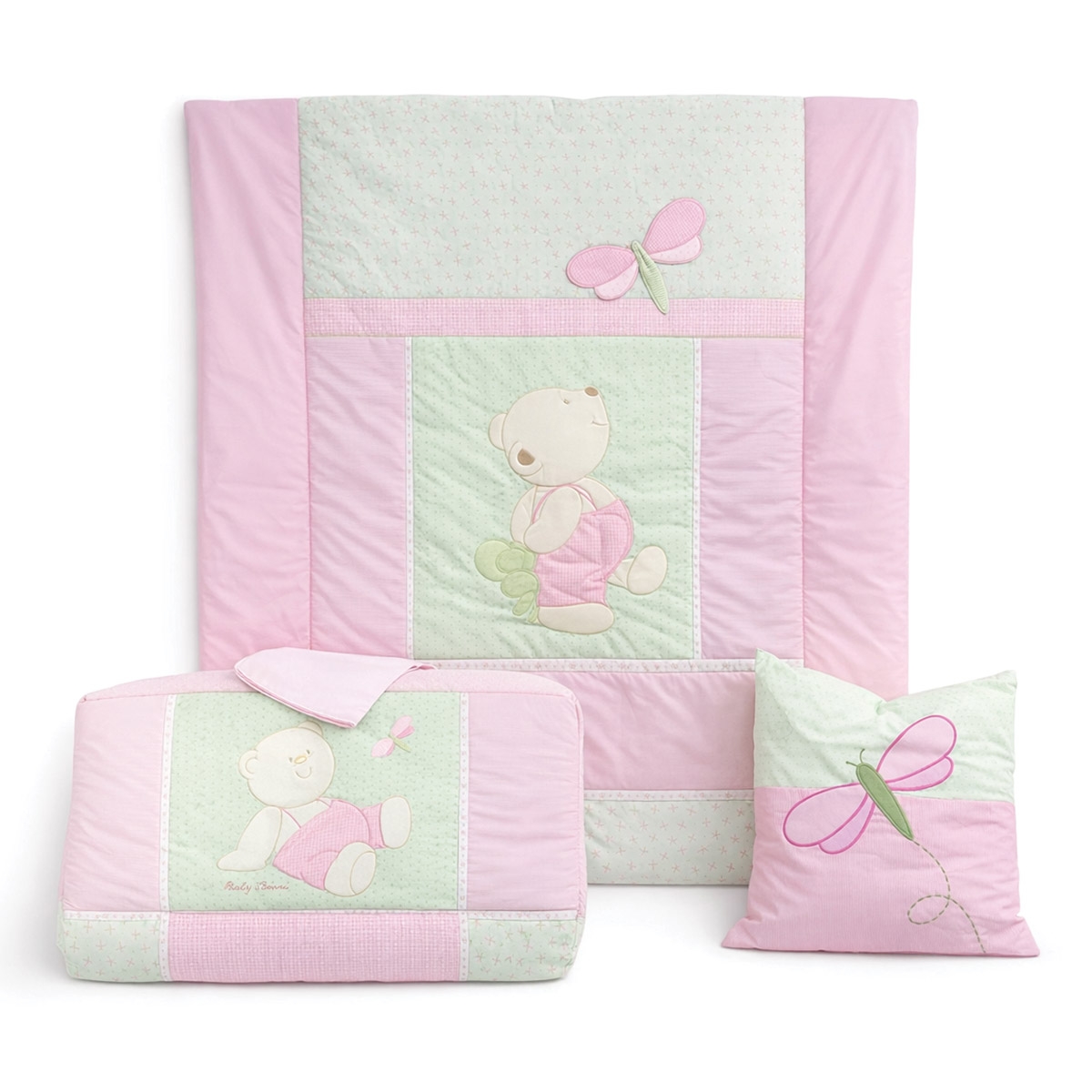 Colorato coordinato copripiumino per lettino baby ricamato in 100% puro cotone con orsetto e libellule ricamate, linea "Somma Bimbi".