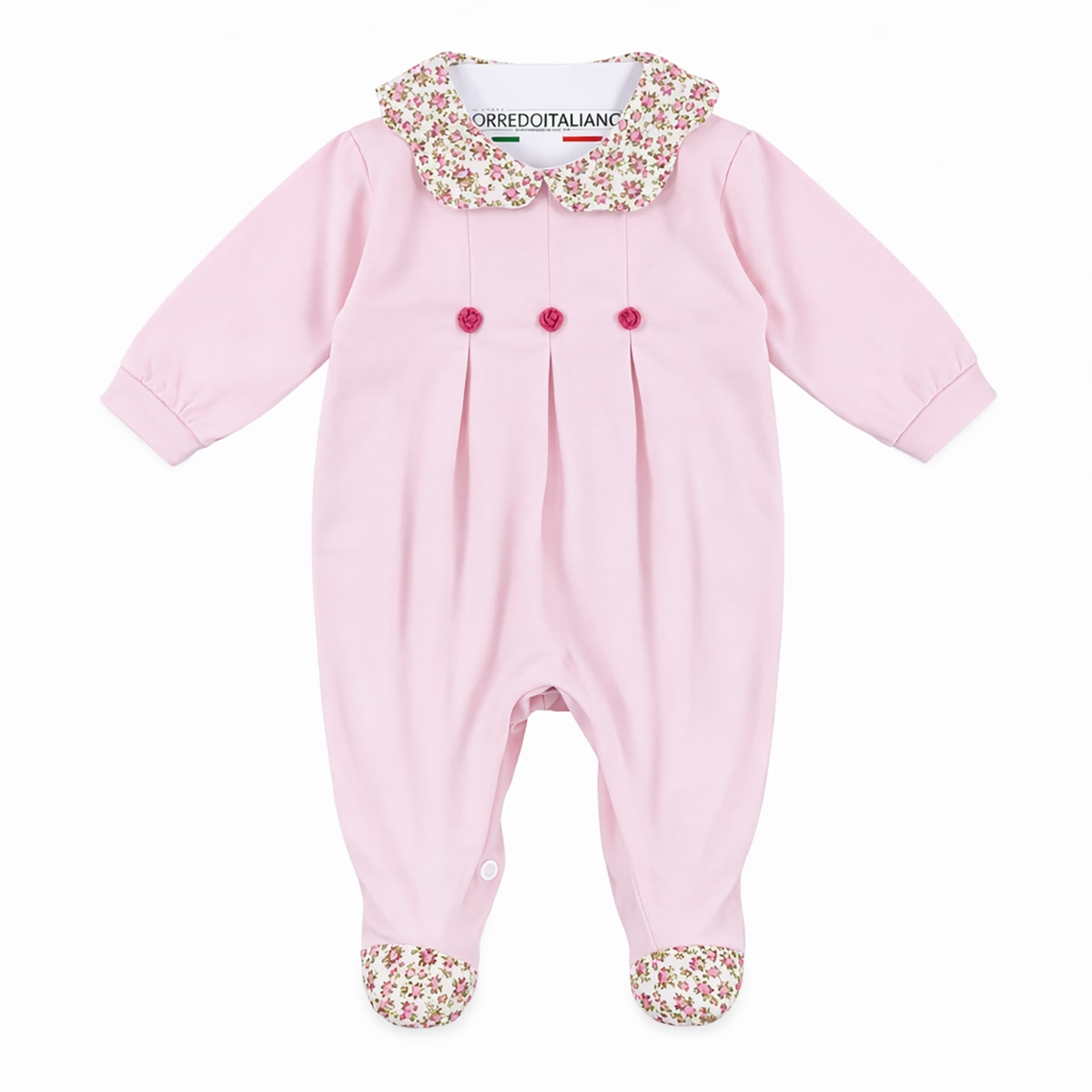 Il modello presenta un raffinato colletto arrotondato con stampa floreale, che si abbina ai dettagli sui piedini, donando un tocco di dolcezza al design.