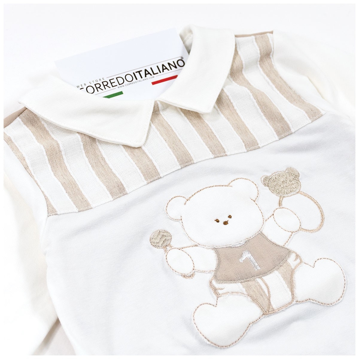 Una tutina dal gusto classico e raffinato, impreziosita da righe beige e ricamo orsetto: un capo Le Chicche che valorizza ogni dettaglio del look del tuo neonato e dona un’eleganza delicata adatta a ogni occasione.