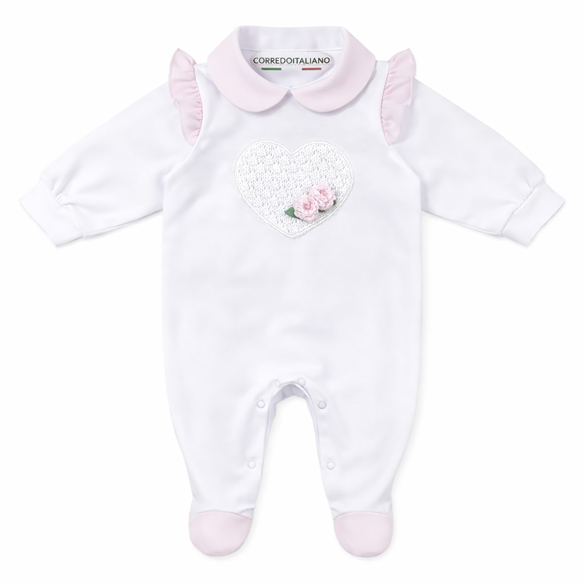 Bianco e rosa cipria creano un contrasto delicato e senza tempo, valorizzato dal cuore ricamato: una tutina che rende speciale ogni momento con grazia e qualità.