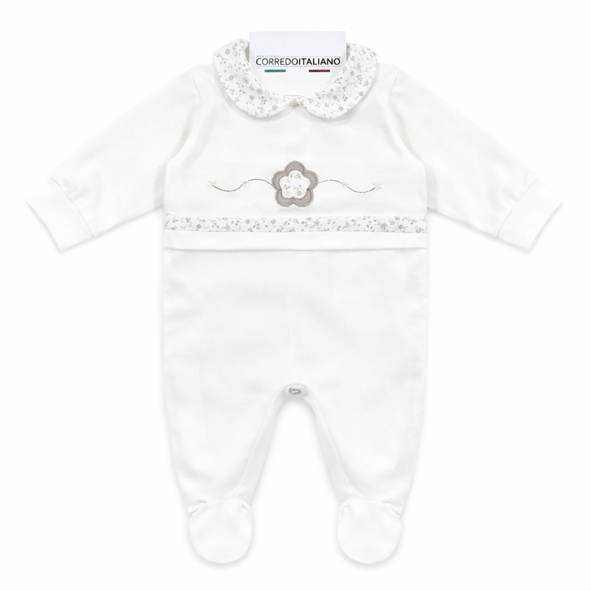 Tutina neonata in cotone avorio con colletto fantasia e ricamo floreale