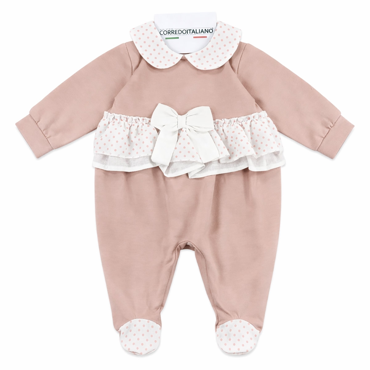 Le tonalità cipria, i dettagli a pois e il fiocco centrale creano un insieme armonioso che valorizza ogni momento, dal riposino alle prime uscite.