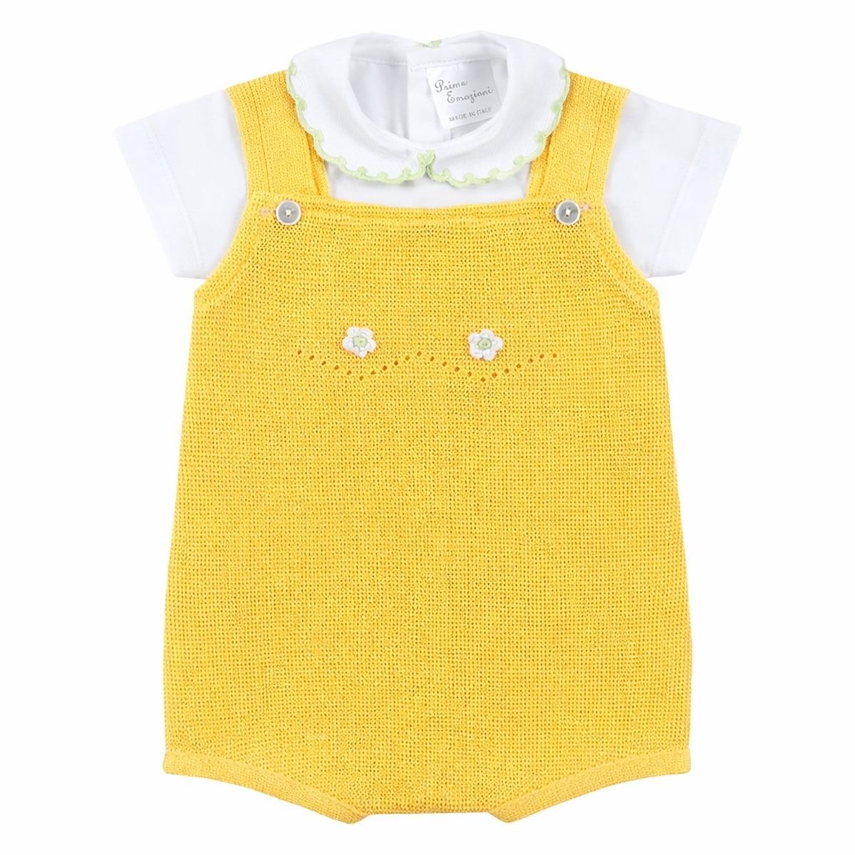 Un completo delicato e raffinato pensato per vestire la tua neonata con eleganza e comfort fin dai primi giorni. Questo completino due pezzi della collezione Prime Emozioni unisce la freschezza del pagliaccetto giallo alla dolcezza della camicina con colletto smerlato ricamato. Realizzato in puro cotone, è studiato per rispettare la pelle sensibile del neonato, garantendo traspirabilità e morbidezza. I dettagli floreali ricamati e applicati donano un tocco romantico e ricercato, rendendolo ideale sia per l’uso quotidiano che per occasioni speciali. Un capo essenziale per un corredino nascita curato e di qualità.