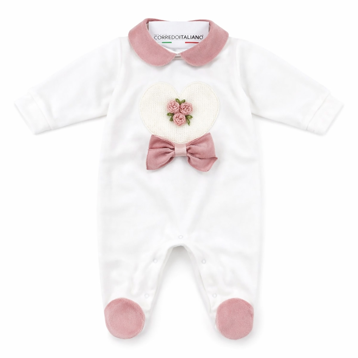 Questa deliziosa tutina per neonata unisce la praticità dell'abbigliamento quotidiano all'eleganza dei dettagli ricercati. Il design presenta un candido colore bianco latte con raffinato colletto rosa antico, impreziosito da un cuore tessuto a maglia decorato con roselline tridimensionali e completato da un grazioso fiocco coordinato.