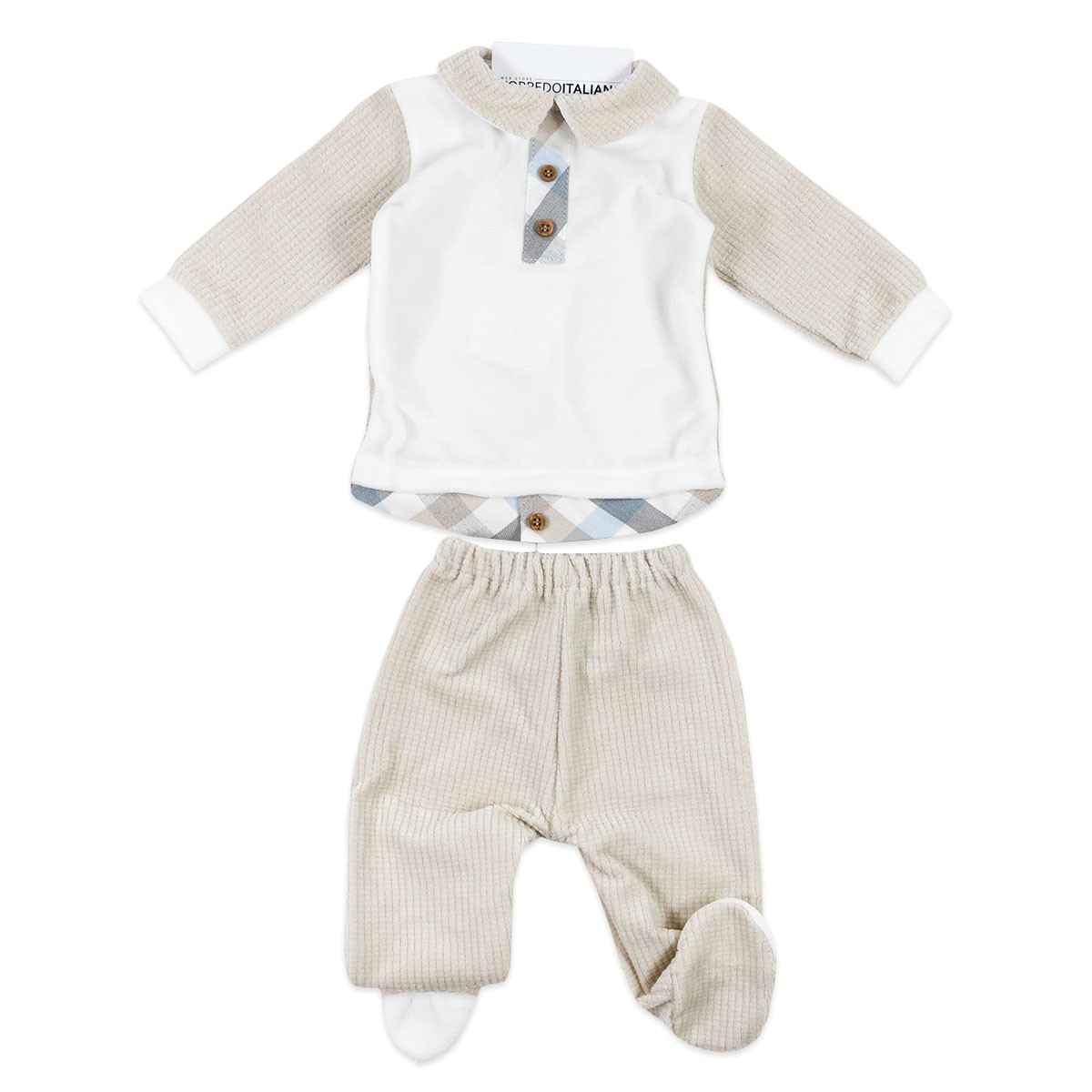 Eleganza e comfort per i primi mesi del tuo bambino: il completino neonato in ciniglia con dettagli tartan della collezione Klaiadi è la scelta perfetta per un look raffinato e pratico.